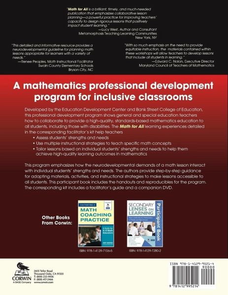 A mathematics professional development program for inclusive classrooms This professional development program shows general and special education teachers how to collaborate to provide a high-quality, standards-based mathematics education to all students, including those with disabilities. This book includes the handouts and reproducibles for the program. The corresponding kit includes a facilitator’s guide and a companion DVD. TheMath for All learning experiences help teachers: Assess students’ strengths and needs Use multiple instructional strategies to teach specific math concepts Tailor lessons based on individual students' strengths and needs to help them achieve high-quality learning outcomes in mathematics