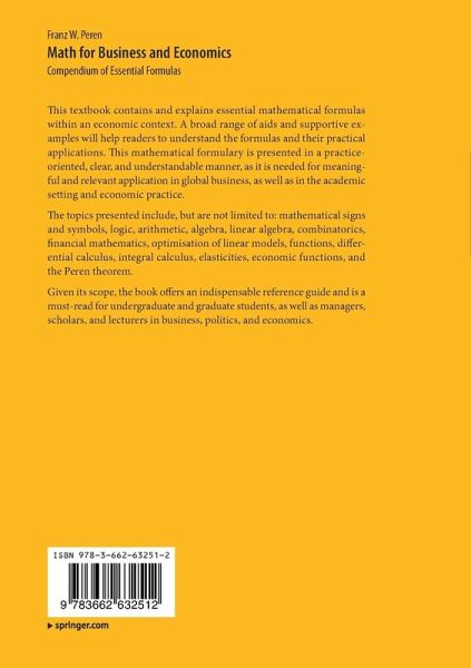 This textbook contains and explains essential mathematical formulas within an economic context. A broad range of aids and supportive examples will help readers to understand the formulas and their practical applications. This mathematical formulary is presented in a practice-oriented, clear, and understandable manner, as it is needed for meaningful and relevant application in global business, as well as in the academic setting and economic practice.
