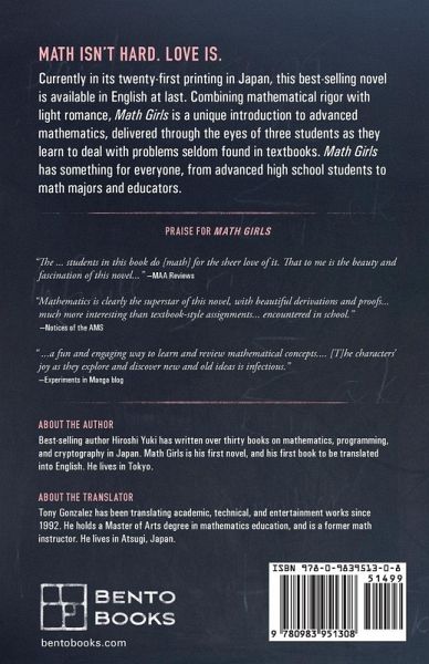 Currently in its eighteenth printing in Japan, this best-selling novel is available in English at last. Combining mathematical rigor with light romance, Math Girls is a unique introduction to advanced mathematics, delivered through the eyes of three students as they learn to deal with problems seldom found in textbooks. Math Girls has something for everyone, from advanced high school students to math majors and educators.
