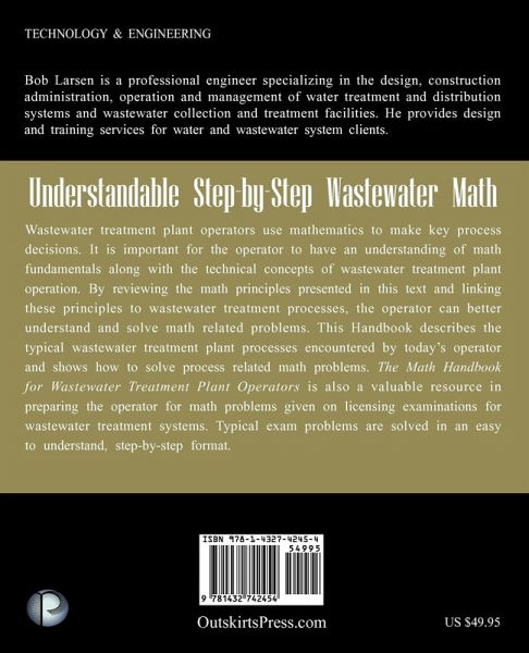 Understandable Step-by-Step Wastewater Math Wastewater treatment plant operators use mathematics to make key process decisions. It is important for the operator to have an understanding of math fundamentals along with the technical concepts of wastewater treatment plant operation. By reviewing the math principles presented in this text and linking these principles to wastewater treatment processes, the operator can better understand and solve math related problems. This Handbook describes the typical wastewater treatment plant processes encountered by today's operator and shows how to solve process related math problems. The Math Handbook for Wastewater Treatment Plant Operators is also a valuable resource in preparing the operator for math problems given on licensing examinations for wastewater treatment systems. Typical exam problems are solved in an easy to understand, step-by-step format.