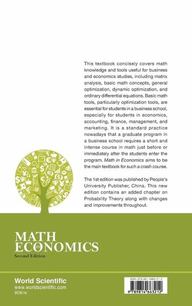 This textbook concisely covers math knowledge and tools useful for business and economics studies, including matrix analysis, basic math concepts, general optimization, dynamic optimization, and ordinary differential equations. Basic math tools, particularly optimization tools, are essential for students in a business school, especially for students in economics, accounting, finance, management, and marketing. It is a standard practice nowadays that a graduate program in a business school requires a short and intense course in math just before or immediately after the students enter the program. Math in Economics aims to be the main textbook for such a crash course. The 1st edition was published by People's University Publisher, China. This new edition contains an added chapter on Probability Theory along with changes and improvements throughout.