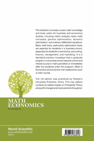 This textbook concisely covers math knowledge and tools useful for business and economics studies, including matrix analysis, basic math concepts, general optimization, dynamic optimization, and ordinary differential equations. Basic math tools, particularly optimization tools, are essential for students in a business school, especially for students in economics, accounting, finance, management, and marketing. It is a standard practice nowadays that a graduate program in a business school requires a short and intense course in math just before or immediately after the students enter the program. Math in Economics aims to be the main textbook for such a crash course. The 1st edition was published by People's University Publisher, China. This new edition contains an added chapter on Probability Theory along with changes and improvements throughout.