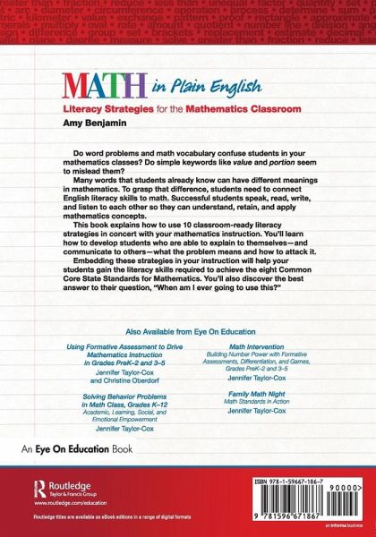 Do word problems and math vocabulary confuse students in your mathematics classes? Do simple keywords like "value" and "portion" seem to mislead them? Many words that students already know can have a different meaning in mathematics. To grasp that difference, students need to connect English literacy skills to math. Successful students speak, read, write, and listen to each other so they can understand, retain, and apply mathematics concepts. This book explains how to use 10 classroom-ready literacy strategies in concert with your mathematics instruction. You'll learn how to develop students who are able to explain to themselves - and communicate to others - what problems mean and how to attack them. Embedding these strategies in your instruction will help your students gain the literacy skills required to achieve the eight Common Core State Standards for Mathematics. You'll discover the best answer to their question, "When am I ever going to use this?" The 10 Strategies: 1. Teaching mathematical words explicitly 2. Teaching academic words implicitly 3. Reinforcing reading comprehension skills that apply to mathematics 4. Teaching mathematics with metaphor and gesture 5. Unlocking the meaning of word problems 6. Teaching note-taking skills for mathematics 7. Using language-based formative assessment in mathematics 8. Connecting memorization to meaning in mathematics 9. Incorporating writing-to-learn activities in mathematics 10. Preparing students for algebraic thinking
