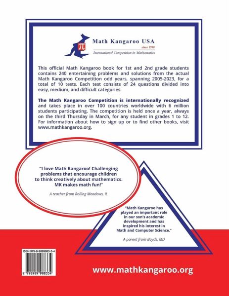 This official Math Kangaroo book for 1st and 2nd grade students contains 240 entertaining problems and solutions from the actual Math Kangaroo Competition odd years, spanning 2005-2023, for a total of 10 tests. Each test consists of 24 questions divided into easy, medium, and difficult categories. The Math Kangaroo Competition is internationally recognized and takes place in over 100 countries worldwide with 6 million students participating. The competition is held once a year, always on the third Thursday in March, for any student in grades 1 to 12. For information about how to sign up or to find other books, visit www.mathkangaroo.org.