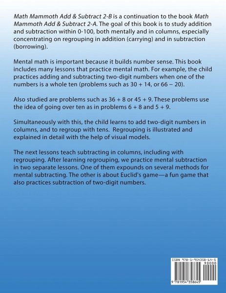 Math Mammoth Add & Subtract 2-B is a continuation to the book Math Mammoth Add & Subtract 2-A. The goal of this book is to study addition and subtraction within 0-100, both mentally and in columns, especially concentrating on regrouping in addition (carrying) and in subtraction (borrowing). Mental math is important because it builds number sense. This book includes many lessons that practice mental math. For example, the child practices adding and subtracting two-digit numbers when one of the numbers is a whole ten (such as 30 + 14 or 66 ¿ 20). The students also learn to solve sums such as 36 + 8 or 45 + 9 with mental math (there is a regrouping), comparing them to the sums 6 + 8 and 5 + 9. Since 6 + 8 fills the first ten and is four more than the next ten, the sum 36 + 8 fills the next whole ten (40), and is four more than that, or 44. At the same time, students also learn to add two-digit numbers with regrouping. This is explained in detail with the help of visual models (base-ten blocks). You are welcome to use actual physical manipulatives, if you prefer. The main concept to understand is that 10 ones are regrouped to form a new ten, and this new ten is written using a little "1" in the tens column. After addition, the lessons focus on column subtraction, initially without regrouping and then with regrouping. The lesson Regrouping practices breaking down a ten into 10 ones. It is crucial that the child understands what happens here. Otherwise, they might end up only memorizing the procedure, and will probably at some point misremember how it was done. If you notice that the child does not understand the concept of regrouping, provide more practice with concrete manipulatives or visual exercises before proceeding. After learning regrouping, students practice mental subtraction in two separate lessons. One of them expounds on several methods for mental subtracting. The other is about Euclid's game-a fun game that also practices subtraction of two-digit numbers.