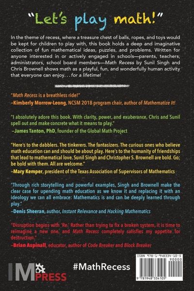 In the theme of recess, where a treasure chest of balls, ropes, and toys would be kept for children to play with, this book holds a deep and imaginative collection of fun mathematical ideas, puzzles, and problems. Written for anyone interested in or actively engaged in schools-parents, teachers, administrators, school board members-Math Recess by Sunil Singh and Chris Brownell shows math as a playful, fun, and wonderfully human activity that everyone can enjoy… for a lifetime! "Math Recess is a breathless ride!" -Kimberly Morrow-Leong, NCSM 2018 program chair, author of Mathematize It! "I absolutely adore this book. With clarity, power, and exuberance, Chris and Sunil spell out and make concrete what it means to play." -James Tanton, PhD, founder of the Global Math Project "Here's to the dabblers. The tinkerers. The fantasizers. The curious ones who believe math education can and should be about play. Here's to the humanity of friendships that lead to mathematical love. Sunil Singh and Christopher S. Brownell are bold. Go, be bold with them. All are welcome." -Mary Kemper, president of the Texas Association of Supervisors of Mathematics "Through rich storytelling and powerful examples, Singh and Brownell make the clear case for upending math education as we know it and replacing it with an ideology we can all embrace: Mathematics is and can be deeply learned through play." -Denis Sheeran, author, Instant Relevance and Hacking Math "Disruption begins with 'Re.' Rather than trying to fix a broken system, it is time to reimagine a new one, and Math Recess completely satisfies my appetite for destruction." -Brian Aspinall, educator, author of Code Breaker and Block Breaker