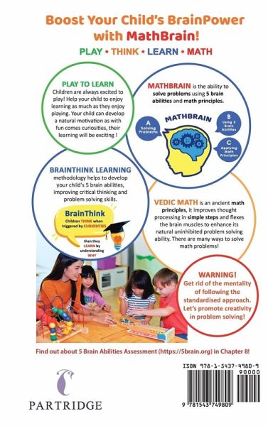 MathBrain is the abillity to solve problems using 5 brain abilities and math principles. This book will guide you in understanding how human brain works and learn so that you can help your child to learn MathBrain through BrainThink Learning. BrainThink Learning is a technique of encouraging children to participate in meaningful and purposeful activities that would stimulate their natural learning abilities. In other words, endorsing fun play times while learning. Vedic Math is a math principles that improves thoughts processing in simple steps and flexes the brain muscles to enhance its natural uninhibited learning ability. With BrainThink Learning, in understanding how human brain works and learns, you can eventually improve your child's critical thinking skills. You will also master the skill to train your child's brain by understanding their 5 Brain Abilities: attention, visualization (cognitive), logical thinking, memory and processing speed. Remember, each child can absolutely enjoy learning as much as they enjoy playing because children have natural motivation to play as well as learn. With fun comes curiosities, and the more curious our children are, the more rewarding their learning will be. Warning! Get rid of using the standard answer mentality! It's the number 1 killer of creativity and learning. Complimentary 5 Brain Abilities assessment worth USD$24.95 (https://5brain.org). Details in chapter 8 !