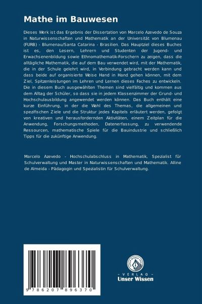 Dieses Werk ist das Ergebnis der Dissertation von Marcelo Azevedo de Souza in Naturwissenschaften und Mathematik an der Universität von Blumenau (FURB) - Blumenau/Santa Catarina - Brasilien. Das Hauptziel dieses Buches ist es, den Lesern, Lehrern und Studenten der Jugend- und Erwachsenenbildung sowie Ethnomathematik-Forschern zu zeigen, dass die alltägliche Mathematik, die auf dem Bau verwendet wird, mit der Mathematik, die in der Schule gelehrt wird, in Verbindung gebracht werden kann und dass beide auf organisierte Weise Hand in Hand gehen können, mit dem Ziel, Spitzenleistungen im Lehren und Lernen dieses Faches zu entwickeln. Die in diesem Buch ausgewählten Themen sind vielfältig und kommen aus dem Alltag der Schüler, so dass sie in jedem Klassenzimmer der Grund- und Hochschulausbildung angewendet werden können. Das Buch enthält eine kurze Einführung, in der die Wahl des Themas, die allgemeinen und spezifischen Ziele und die Struktur jedes Kapitels erläutert werden, gefolgt von kreativen und herausfordernden Aktivitäten, einem Zeitplan für die Anwendung, Forschungsmethoden, Datenerfassung, zu verwendende Ressourcen, mathematische Spiele für die Bauindustrie und schließlich Tipps für die zukünftige Anwendung.