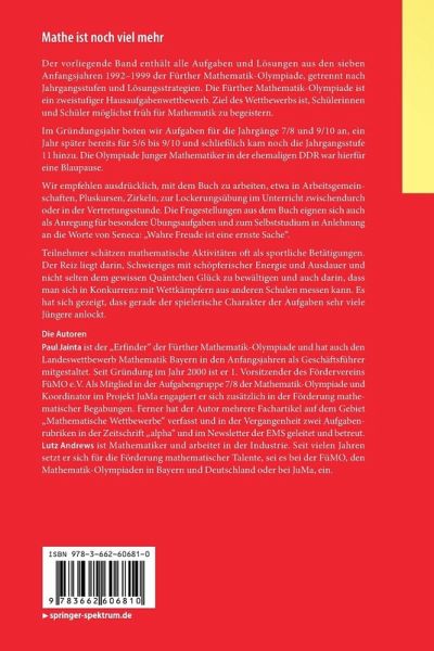 Der vorliegende Band enthält alle Aufgaben und Lösungen aus den sieben Anfangsjahren 1992-1999 der Fürther Mathematik-Olympiade, getrennt nach Jahrgangsstufen und Lösungsstrategien. Die Fürther Mathematik-Olympiade ist ein zweistufiger Hausaufgabenwettbewerb. Ziel des Wettbewerbs ist, Schülerinnen und Schüler möglichst früh für Mathematik zu begeistern.