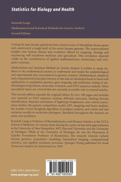 During the past decade, geneticists have cloned scores of Mendelian disease genes and constructed a rough draft of the entire human genome. The unprecedented insights into human disease and evolution offered by mapping, cloning, and sequencing will transform medicine and agriculture. This revolution depends vitally on the contributions of applied mathematicians, statisticians, and computer scientists. Mathematical and Statistical Methods for Genetic Analysis is written to equip students in the mathematical sciences to understand and model the epidemiological and experimental data encountered in genetics research. Mathematical, statistical, and computational principles relevant to this task are developed hand in hand with applications to population genetics, gene mapping, risk prediction, testing of epidemiological hypotheses, molecular evolution, and DNA sequence analysis. Many specialized topics are covered that are currently accessible only in journal articles. This second edition expands the original edition by over 100 pages and includes new material on DNA sequence analysis, diffusion processes, binding domain identification, Bayesian estimation of haplotype frequencies, case-control association studies, the gamete competition model, QTL mapping and factor analysis, the Lander-Green-Kruglyak algorithm of pedigree analysis, and codon and rate variation models in molecular phylogeny. Sprinkled throughout the chapters are many new problems.
