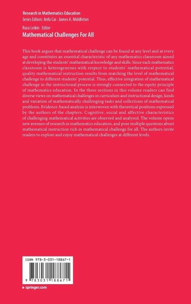 This book argues that mathematical challenge can be found at any level and at every age and constitutes an essential characteristic of any mathematics classroom aimed at developing the students' mathematical knowledge and skills. Since each mathematics classroom is heterogeneous with respect to students' mathematical potential, quality mathematical instruction results from matching the level of mathematical challenge to different students' potential. Thus, effective integration of mathematical challenge in the instructional process is strongly connected to the equity principle of mathematics education. In the three sections in this volume readers can find diverse views on mathematical challenges in curriculum and instructional design, kinds and variation of mathematically challenging tasks and collections of mathematical problems. Evidence-based analysis is interwoven with theoretical positions expressed by the authors of the chapters. Cognitive, social and affective characteristicsof challenging mathematical activities are observed and analyzed. The volume opens new avenues of research in mathematics education, and pose multiple questions about mathematical instruction rich in mathematical challenge for all. The authors invite readers to explore and enjoy mathematical challenges at different levels.