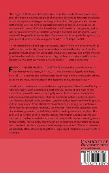 Famous mathematical constants include the ratio of circular circumference to diameter, pi=3.14 ..., and the natural logarithmic base, e=2.178 ... Students and professionals usually can name at most a few others, but there are many more buried in the literature and awaiting discovery. How do such constants arise, and why are they important? Here Steven Finch provides 136 essays, each devoted to a mathematical constant or a class of constants, from the well known to the highly exotic. Topics covered include the statistics of continued fractions, chaos in nonlinear systems, prime numbers, sum-free sets, isoperimetric problems, approximation theory, self-avoiding walks and the Ising model (from statistical physics), binary and digital search trees (from theoretical computer science), the Prouhet-Thue-Morse sequence, complex analysis, geometric probability and the traveling salesman problem. This book will be helpful both to readers seeking information about a specific constant, and to readers who desire a panoramic view of all constants coming from a particular field, for example combinatorial enumeration or geometric optimization. Unsolved problems appear virtually everywhere as well. This is an outstanding scholarly attempt to bring together all significant mathematical constants in one place.