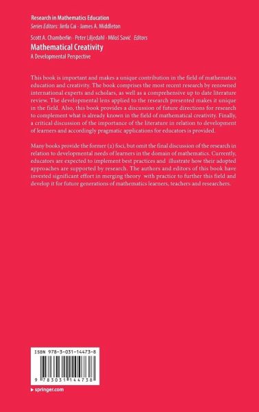 This book is important and makes a unique contribution in the field of mathematics education and creativity. The book comprises the most recent research by renowned international experts and scholars, as well as a comprehensive up to date literature review. The developmental lens applied to the research presented makes it unique in the field. Also, this book provides a discussion of future directions for research to complement what is already known in the field of mathematical creativity. Finally, a critical discussion of the importance of the literature in relation to development of learners and accordingly pragmatic applications for educators is provided. Many books provide the former (2) foci, but omit the final discussion of the research in relation to developmental needs of learners in the domain of mathematics. Currently, educators are expected to implement best practices and illustrate how their adopted approaches are supported by research. The authors and editors of this book have invested significant effort in merging theory with practice to further this field and develop it for future generations of mathematics learners, teachers and researchers.