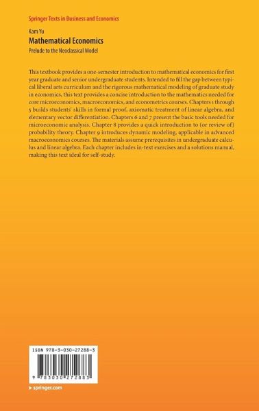 This textbook provides a one-semester introduction to mathematical economics for first year graduate and senior undergraduate students. Intended to fill the gap between typical liberal arts curriculum and the rigorous mathematical modeling of graduate study in economics, this text provides a concise introduction to the mathematics needed for core microeconomics, macroeconomics, and econometrics courses. Chapters 1 through 5 builds students' skills in formal proof, axiomatic treatment of linear algebra, and elementary vector differentiation. Chapters 6 and 7 present the basic tools needed for microeconomic analysis. Chapter 8 provides a quick introduction to (or review of) probability theory. Chapter 9 introduces dynamic modeling, applicable in advanced macroeconomics courses. The materials assume prerequisites in undergraduate calculus and linear algebra. Each chapter includes in-text exercises and a solutions manual, making this text ideal for self-study.