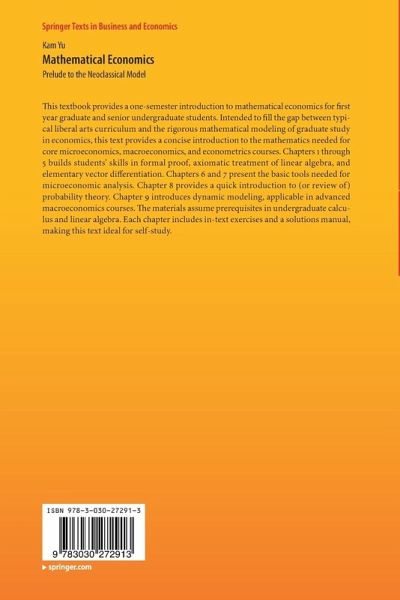 This textbook provides a one-semester introduction to mathematical economics for first year graduate and senior undergraduate students. Intended to fill the gap between typical liberal arts curriculum and the rigorous mathematical modeling of graduate study in economics, this text provides a concise introduction to the mathematics needed for core microeconomics, macroeconomics, and econometrics courses. Chapters 1 through 5 builds students' skills in formal proof, axiomatic treatment of linear algebra, and elementary vector differentiation. Chapters 6 and 7 present the basic tools needed for microeconomic analysis. Chapter 8 provides a quick introduction to (or review of) probability theory. Chapter 9 introduces dynamic modeling, applicable in advanced macroeconomics courses. The materials assume prerequisites in undergraduate calculus and linear algebra. Each chapter includes in-text exercises and a solutions manual, making this text ideal for self-study.