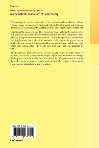 Based on lectures given in Paris over several years, this textbook will be useful for rigorous, up-to-date courses on the subject. Apart from an interest in strategic thinking and a taste for mathematical formalism, the only prerequisite for reading the book is a solid knowledge of mathematics at the undergraduate level, including basic analysis, linear algebra, and probability.