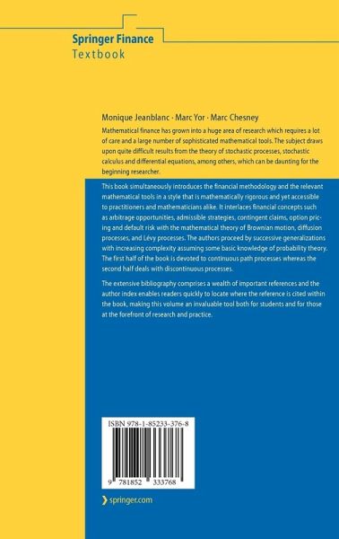Mathematical finance has grown into a huge area of research which requires a large number of sophisticated mathematical tools. This book simultaneously introduces the financial methodology and the relevant mathematical tools in a style that is mathematically rigorous and yet accessible to practitioners and mathematicians alike. It interlaces financial concepts such as arbitrage opportunities, admissible strategies, contingent claims, option pricing and default risk with the mathematical theory of Brownian motion, diffusion processes, and Lévy processes. The first half of the book is devoted to continuous path processes whereas the second half deals with discontinuous processes.