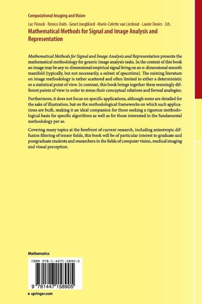 Mathematical Methods for Signal and Image Analysis and Representation presents the mathematical methodology for generic image analysis tasks. In the context of this book an image may be any m-dimensional empirical signal living on an n-dimensional smooth manifold (typically, but not necessarily, a subset of spacetime). The existing literature on image methodology is rather scattered and often limited to either a deterministic or a statistical point of view. In contrast, this book brings together these seemingly different points of view in order to stress their conceptual relations and formal analogies.