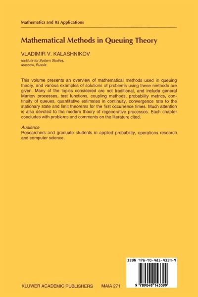 The material of this book is based on several courses which have been delivered for a long time at the Moscow Institute for Physics and Technology. Some parts have formed the subject of lectures given at various universities throughout the world: Freie Universitat of Berlin, Chalmers University of Technology and the University of Goteborg, University of California at Santa Barbara and others. The subject of the book is the theory of queues. This theory, as a mathematical discipline, begins with the work of A. Erlang, who examined a model of a telephone station and obtained the famous formula for the distribution of the number of busy lines which is named after him. Queueing theory has been applied to the study of numerous models: emergency aid, road traffic, computer systems, etc. Besides, it has lead to several related disciplines such as reliability and inventory theories which deal with similar models. Nevertheless, many parts of the theory of queues were developed as a "pure science" with no practical applications. The aim of this book is to give the reader an insight into the mathematical methods which can be used in queueing theory and to present examples of solving problems with the help of these methods. Of course, the choice of the methods is quite subjective. Thus, many prominent results have not even been mentioned.
