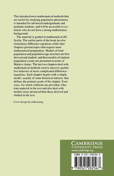 This introduction to mathematical methods that are useful for studying population phenomena is intended for advanced undergraduate and graduate students, and will be accessible to scientists who do not have a strong mathematics background. The material is graded in mathematical difficulty. The earlier parts of the book involve elementary diference equations while later chapters present topics that require more mathematical preparation. Models of total population and population age structure are first derived and studied, and then models of random population events are presented in terms of Markov chains. The last two chapters deal with mathematical methods used to uncover qualitative behaviour of more complicated difference equations. Each chapter begins with a simple model, usually of some historical interest, that defines the primary goals of the chapter. Exercises, for which solutions are provided, illustrate material in the text and also deal with models more advanced than those derived and studied in the text.