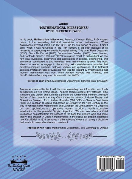 In his book, Mathematical Milestones, Professor Clement Falbo, PhD, shares many of the interesting historical anecdotes about mathematics. When Archimedes invented calculus in 250 BCE, like the first snows of winter, it didn't stick, when it was reinvented in the 17th century, it did stick because of its necessity in burgeoning world-wide industrial activity. This time, Rene Descartes (1630), Pierre De Fermat (1635), Bonaventura Cavalieri (1635), Isaac Newton, and Gottfried Leibnitz (1660) and (1670) were given credit. In Falbo's book we see how new inventions, discoveries and applications in science, engineering, and economics contributed to and benefited from mathematical growth. This book allows the reader to engage in the exciting axiom-and-theorem narrative that develops complex numbers, matrices, vectors, and quaternions, all in historical contexts. Professor Falbo provides us with food for thought by hypothesizing that modern mathematics was born when Abstract Algebra was invented, and Non-Euclidean Geometry was discovered in the 1800's. -Professor Jean Chan, Mathematics Department, Sonoma State University Anyone who reads this book will discover interesting new information and fresh perspectives on well- known ideas. The brief calculus chapter by Professor Falbo is exciting and vibrant and even has a proof of the fundamental theorem. A unique feature of this book is the way Clem traces the history of Game Theory and Operations Research from Jiuzhan Suanshu (300 BCE) in China to Seki Kawa (1683 CE) in Japan to Gauss and Jordan in Germany in the 19th Century all the way to Von Neumann, Morgenstern, and Dantzig in the 20th Century. His Chapters on matrix applications and operations research provide a readily accessible introduction to the powerful Simplex Algorithm. We can see where artificial intelligence originated from the sections of the book that explore logic and game theory. The chapter "A Crisis in Mathematics" in the books last section, describes how Kurt Godel, in 1931 destroyed mathematicians' dreams of having a discipline that was both comprehensive and consistent. -Professor Ken Ross, Mathematics Department, The University of Oregon