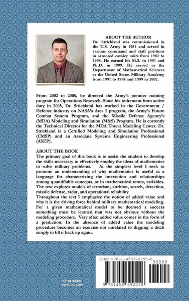 The primary goal of this book is to assist the student to develop the skills necessary to effectively employ the ideas of mathematics to solve military problems. At the simplest level I seek to promote an understanding of why mathematics is useful as a language for characterizing the interaction and relationships among quantifiable concepts, or in mathematical terms, variables. The text explores models of terrorism, attrition, search, detection, missile defense, radar, and operational reliability Throughout the text I emphasize the notion of added value and why it is the driving force behind military mathematical modeling. For a given mathematical model to be deemed a success something must be learned that was not obvious without the modeling procedure. Very often added value comes in the form of a prediction. In the absence of added value the modeling procedure becomes an exercise not unrelated to digging a ditch simply to fill it back up again.