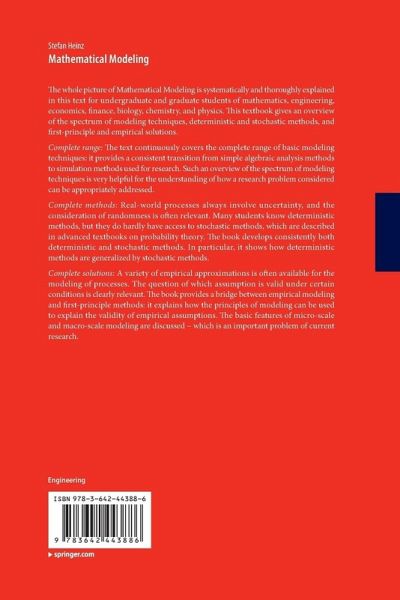 The whole picture of Mathematical Modeling is systematically and thoroughly explained in this text for undergraduate and graduate students of mathematics, engineering, economics, finance, biology, chemistry, and physics. This textbook gives an overview of the spectrum of modeling techniques, deterministic and stochastic methods, and first-principle and empirical solutions.