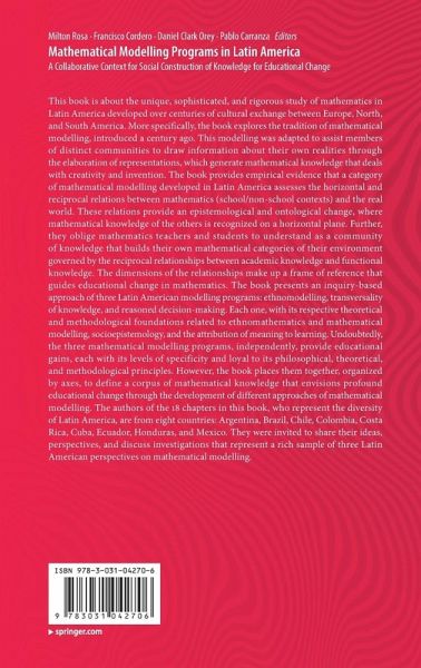 This book is about the unique, sophisticated, and rigorous study of mathematics in Latin America developed over centuries of cultural exchange between Europe, North, and South America. More specifically, the book explores the tradition of mathematical modelling, introduced a century ago. This modelling was adapted to assist members of distinct communities to draw information about their own realities through the elaboration of representations, which generate mathematical knowledge that deals with creativity and invention. The book provides empirical evidence that a category of mathematical modelling developed in Latin America assesses the horizontal and reciprocal relations between mathematics (school/non-school contexts) and the real world. These relations provide an epistemological and ontological change, where mathematical knowledge of the others is recognized on a horizontal plane. Further, they oblige mathematics teachers and students to understand as a community of knowledge thatbuilds their own mathematical categories of their environment governed by the reciprocal relationships between academic knowledge and functional knowledge. The dimensions of the relationships make up a frame of reference that guides educational change in mathematics. The book presents an inquiry-based approach of three Latin American modelling programs: ethnomodelling, transversality of knowledge, and reasoned decision-making. Each one, with its respective theoretical and methodological foundations related to ethnomathematics and mathematical modelling, socioepistemology, and the attribution of meaning to learning. Undoubtedly, the three mathematical modelling programs, independently, provide educational gains, each with its levels of specificity and loyal to its philosophical, theoretical, and methodological principles. However, the book places them together, organized by axes, to define a corpus of mathematical knowledge that envisions profound educational change through the development of different approaches of mathematical modelling. The authors of the 18 chapters in this book, who represent the diversity of Latin America, are from eight countries: Argentina, Brazil, Chile, Colombia, Costa Rica, Cuba, Ecuador, Honduras, and Mexico. They were invited to share their ideas, perspectives, and discuss investigations that represent a rich sample of three Latin American perspectives on mathematical modelling.