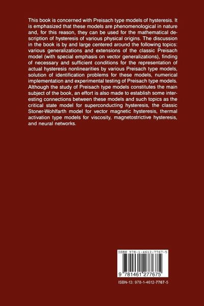 The purpose of this book is to describe in sufficient detail the mathematical models of hysteresis nonlinearities with "nonlocal memories. " The distinct feature of these nonlinearities is that their future states depend on past histories of input variations. It turns out that memories of hysteresis nonlinearities are quite selective. Indeed, experiments show that only some past input extrema (not the entire input variations) leave their marks upon future states of hysteresis nonlinearities. Thus, special mathematical tools are needed to describe nonlocal selective memories of hysteresis nonlinearities. The origin of such tools can be traced back to the landmark paper of Preisach. The book is primarily concerned with Preisach-type models of hysteresis. All these models have a common generic feature; they are constructed as superposi tions of simplest hysteresis nonlinearities-rectangular loops. The discussion is by and large centered around the following topics: various generalizations and extensions of the classical Preisach model (with special emphasis on vector generalizations), finding of necessary and sufficient conditions for the represen tation of actual hysteresis nonlinearities by various Preisach-type models, solution of identification problems for these models, and numerical implementa tion and experimental testing of Preisach-type models. Although the study of Preisach-type models constitutes the main subject of the book, some effort is also made to establish some interesting connections between these models and such topics as the critical state model for superconducting hysteresis, the classi cal Stoner-Wohlfarth model for vector magnetic hysteresis, thermal activation type models for viscosity, magnetostrictive hysteresis and neural networks.