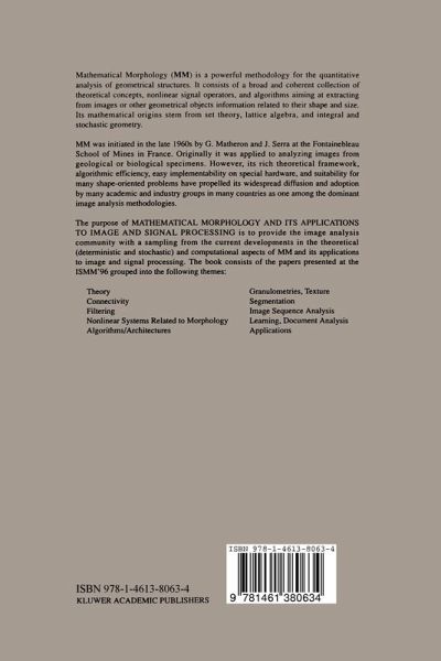The purpose of Mathematical Morphology and its Applications to Image and Signal Processing is to provide the image analysis community with a sampling from the current developments in the theoretical (deterministic and stochastic) and computational aspects of MM and its applications to image and signal processing. The book consists of the papers presented at the ISMM'96 grouped into the following themes: