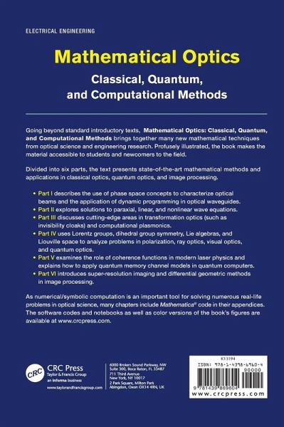Going beyond standard introductory texts, Mathematical Optics: Classical, Quantum, and Computational Methods brings together many new mathematical techniques from optical science and engineering research. Profusely illustrated, the book makes the material accessible to students and newcomers to the field. Divided into six parts, the text presents state-of-the-art mathematical methods and applications in classical optics, quantum optics, and image processing. Part I describes the use of phase space concepts to characterize optical beams and the application of dynamic programming in optical waveguides. Part II explores solutions to paraxial, linear, and nonlinear wave equations. Part III discusses cutting-edge areas in transformation optics (such as invisibility cloaks) and computational plasmonics. Part IV uses Lorentz groups, dihedral group symmetry, Lie algebras, and Liouville space to analyze problems in polarization, ray optics, visual optics, and quantum optics. Part V examines the role of coherence functions in modern laser physics and explains how to apply quantum memory channel models in quantum computers. Part VI introduces super-resolution imaging and differential geometric methods in image processing. As numerical/symbolic computation is an important tool for solving numerous real-life problems in optical science, many chapters include Mathematica® code in their appendices. The software codes and notebooks as well as color versions of the book's figures are available at www.crcpress.com.
