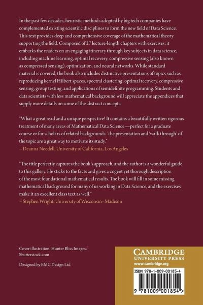 This text explores a diverse set of data science topics through a mathematical lens, helping mathematicians become acquainted with data science in general, and machine learning, optimal recovery, compressive sensing, optimization, and neural networks in particular. It will also be valuable to data scientists seeking mathematical sophistication.
