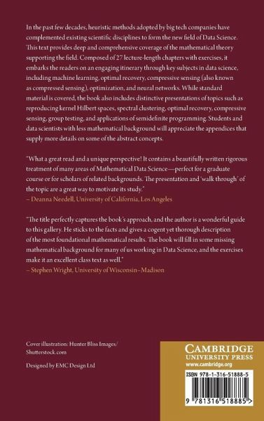 This text provides deep and comprehensive coverage of the mathematical background for data science, including machine learning, optimal recovery, compressed sensing, optimization, and neural networks. In the past few decades, heuristic methods adopted by big tech companies have complemented existing scientific disciplines to form the new field of Data Science. This text embarks the readers on an engaging itinerary through the theory supporting the field. Altogether, twenty-seven lecture-length chapters with exercises provide all the details necessary for a solid understanding of key topics in data science. While the book covers standard material on machine learning and optimization, it also includes distinctive presentations of topics such as reproducing kernel Hilbert spaces, spectral clustering, optimal recovery, compressed sensing, group testing, and applications of semidefinite programming. Students and data scientists with less mathematical background will appreciate the appendices that provide more background on some of the more abstract concepts.