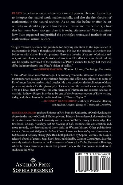 Plato is the first scientist whose work we still possess. He is our first writer to interpret the natural world mathematically, and also the first theorist of mathematics in the natural sciences. As no one else before or after, he set out why we should suppose a link between nature and mathematics, a link that has never been stronger than it is today. Mathematical Plato examines how Plato organized and justified the principles, terms, and methods of our mathematical, natural science. "Roger Sworder deserves our gratitude for drawing attention to the significance of mathematics in Plato's thought and writings. He lays the principal discussions out before us with clarity. He also presents Plato as a theorist of nature: of physics and not just metaphysics, to use Aristotle's distinction. Not all readers, we should admit, will be equally convinced of the usefulness of Plato's science for today, but they will all be led more deeply into Plato's vision of reality."--ANDREW DAVISON, Westcott House, Cambridge "Here is Plato for an anti-Platonic age. The author gives careful attention to some of the most important passages in the Platonic dialogues and offers new solutions to some of Plato's most famous mathematical puzzles. He then considers the implications of these penetrating studies for the philosophy of science, and the natural sciences especially. This is a book that revivifies the core themes of Platonism and restores science to worship. It shows Roger Sworder to be one of the foremost students of Plato writing today, and places him in the noble tradition of Thomas Taylor."--RODNEY BLACKHIRST, author of Primordial Alchemy and Modern Religion: Essays on Traditional Cosmology