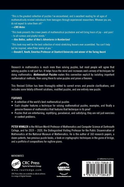 Peter Winkler is the William Morrill Professor of Mathematics and Computer Science at Dartmouth College, and for 2019 - 2020, the Distinguished Visiting Professor for the Public Dissemination of Mathematics at the National Museum of Mathematics. He is the author of 160 research papers, a dozen patents, two previous puzzle books, a book on cryptographic techniques in the game of bridge, and a portfolio of compositions for ragtime piano.