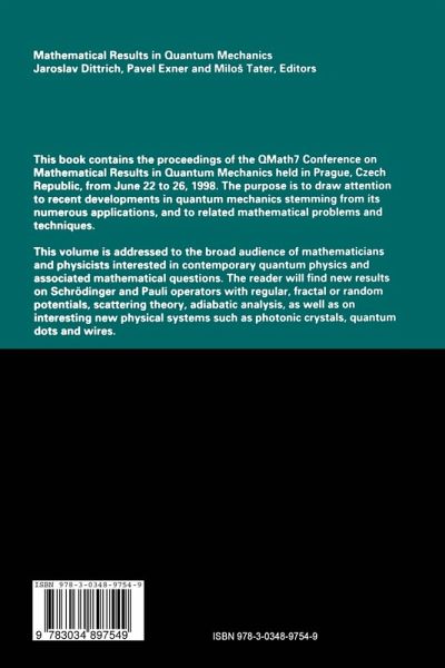 I Plenary talks.- An adiabatic theorem without a gap condition.- Two-dimensional periodic Pauli operator. The effective masses at the lower edge of the spectrum.- Spectral problems in the theory of photonic crystals.- Optimal eigenvalues for some Laplacians and Schrödinger operators depending on curvature.- The spectral shift operator.- On the scattering operator for the Schrödinger equation with a time-dependent potential.- H_2-construction and some applications.- Scattering with time periodic potentials and cyclic states.- Some geometry related to decay properties of the resolvent of a class of symmetric operators.- On some asymptotic formulas in the strong localization regime of the theory of disordered systems.- Spectral measures and category.- Quantum dots. A survey of rigorous results.- II Session talks.- A simple model of concentrated nonlinearity.- Anomalous electron trapping by magnetic flux tubes and electric current vortices.- On the absolutely continuous energy distribution of a quantum mechanical system in a bounded domain.- Some aspects of generalized contact interaction in one-dimensional quantum mechanics.- Traces and trace norms for semigroup differences...- About a resolvent formula.- The determinant anomaly in low-dimensional quantum systems.- Linear Boltzmann equation as the weak coupling limit of the random Schrödinger equation.- Coexistence of different spectral types for almost periodic Schrödinger equations in dimension one.- Dynamical localization for random Schrödinger operators and an application to the almost Mathieu operator.- On fractal structure of the spectrum for periodic point perturbations of the Schrödinger operator with a uniform magnetic field.- A Weyl-Berry formula for the scattering operator associated to self-similarpotentials on the line.- Localization and Lifshitz tails for random quantum waveguides.- Birman-Schwinger analysis for bound states in a pair of parallel quantum waveguides with a semitransparent boundary.- On the absolute continuity of spectra of periodic elliptic operators.- Hardy inequalities for magnetic Dirichlet forms.- Adiabatic curvature, chaos and the deformation of Riemann surfaces.- Operator interpretation of resonances arising in spectral problems for 2 x 2 matrix Hamiltonians.- On the operator-norm convergence of the Trotter-Kato product formula.- A particular case of the inverse problem for the Sturm-Liouville equation with parameter dependent potential.- One-dimensional Schrödinger operators with decaying potentials.- Stability of limiting absorption under singular perturbations.- Existence of averaging integrals for self-adjoint operators.- Monotonicity versus non-monotonicity in random operators.- A model in perturbation theory.- Band gap of the spectrum in periodically curved quantum waveguides.- A list of other talks.- A list of participants.