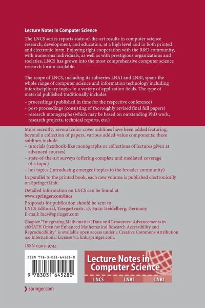 The 37 full papers presented were carefully reviewed and selected from 46 submissions. The papers are organized in subject areas as follows: plenary lectures; number theory and related areas; novel formalisations of mathematics in lean; software for the applications of group theory to combinatorics; classical algebraic geometry & modern computer algebra: innovative software design and its applications; advancing computer algebra with…mehr