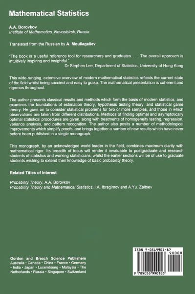 A wide-ranging, extensive overview of modern mathematical statistics, this work reflects the current state of the field while being succinct and easy to grasp. The mathematical presentation is coherent and rigorous throughout. The author presents classical results and methods that form the basis of modern statistics, and examines the foundations of estimation theory, hypothesis testing theory and statistical game theory. He then considers statistical problems for two or more samples, and those in which observations are taken from different distributions. Methods of finding optimal and asymptotically optimal statistical procedures are given, along with treatments of homogeneity testing, regression, variance analysis and pattern recognition. The author also posits a number of methodological improvements that simplify proofs, and brings together a number of new results which have never before been published in a single monograph.