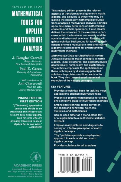 This revised edition presents the relevant aspects of transformational geometry, matrix algebra, and calculus to those who may be lacking the necessary mathematical foundations of applied multivariate analysis. It brings up-to-date many definitions of mathematical concepts and their operations. It also clearly defines the relevance of the exercises to concerns within the business community and the social and behavioral sciences. Readers gain a technical background for tackling applications-oriented multivariate texts and receive a geometric perspective for understanding multivariate methods."Mathematical Tools for Applied Multivariate Analysis, Revised Edition illustrates major concepts in matrix algebra, linear structures, and eigenstructures geometrically, numerically, and algebraically. The authors emphasize the applications of these techniques by discussing potential solutions to problems outlined early in the book. They also present small numerical examples of the various concepts.