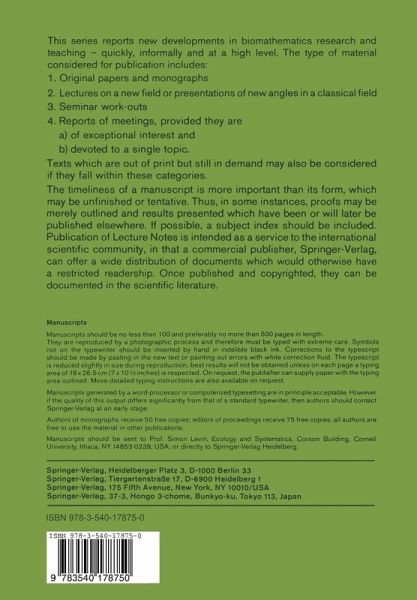 Introductory Lectures.- Chaos and fractals.- Recurrent themes in mathematical biology.- I. Mathematical Ecology and Population Biology.- The Structure of Populations and Communities.- Fantastic voyage into the deep: marine biofluid mechanics.- On the mathematical synthesis of physiological and behavioural mechanisms and population dynamics.- A necessary and sufficient assembly rule for real ecosystems.- Markovian foraging models.- The theory of population dynamics: back to first principles.- Dispersal.- Ecological and evolutionary aspects of dispersal.- The speeds of traveling frontal waves in heterogeneous environments.- Quantitative modeling of growth and dispersal in population models.- The interaction between dispersal and dormancy strategies in varying and heterogeneous environments.- Segregation structures of competing species mediated by a diffusive predator.- A spatially aggregating population model involving size-distributed dynamics.- Evolution.- Evolution of the number of sexes.- A lattice model for population biology.- Population genetical mechanism of molecular evolution - stochastic selection as an alternative to random drift -.- Evolutionary and ecological stability of prey-predator systems with predatory switching.- II. Mathematical Theories of Pattern and Morphogenesis.- Morphogenesis and Pattern Formation.- Pattern formation by coupled oscillations: the pigmentation patterns on the shells of molluscs.- From map systems to plant morphogenesis.- The cortical tractor: a new model for epithelial morphogenesis.- Pattern Formation in Dictyostelium discoideum.- An equilibrium theory of cell distribution in Dictyostelium discoideum.- A model for pattern formation in Dictyostelium discoideum.- A density dependent model for prestalk/prespore patternformation in Dictyostelium discoideum I. Basic mathematical framework.- Origin of bursting and birhythmicity in a model for cyclic AMP oscillations in Dictyostelium cells.- III. Theoretical Neurosciences and Related Problems in Physiology.- Neurosciences.- Mathematical modelling of macroscopic brain phenomena.- A formal classification of bursting mechanisms in excitable systems.- On the topological representation of signals in self-organizing nerve fields.- The dynamics of a glia-modulated neural network and its relation to brain functions.- Self-organization in nervous systems: some illustrations.- Physiology and Related Problems.- Toward molecular sensory physiology: mathematical models.- Outline of some recent results on the first-passage-time problem in biological modeling.- Active rotator model for large populations of oscillatory and excitable elements.- The harnessing and stability of striated muscle.
