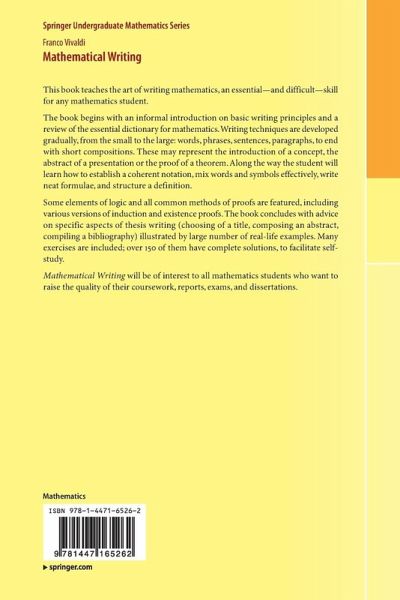 The book begins with an informal introduction on basic writing principles and a review of the essential dictionary for mathematics. Writing techniques are developed gradually, from the small to the large: words, phrases, sentences, paragraphs, to end with short compositions. These may represent the introduction of a concept, the abstract of a presentation or the proof of a theorem. Along the way the student will learn how to establish a coherent notation, mix words and symbols effectively, write neat formulae, and structure a definition.