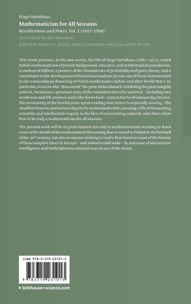 This book presents, in his own words, the life of Hugo Steinhaus (1887-1972), noted Polish mathematician of Jewish background, educator, and mathematical popularizer. A student of Hilbert, a pioneer of the foundations of probability and game theory, and a contributor to the development of functional analysis, he was one of those instrumental to the extraordinary flowering of Polish mathematics before and after World War I. In particular, it was he who "discovered" the great Stefan Banach. Exhibiting his great integrity and wit, Steinhaus's personal story of the turbulent times he survived - including two world wars and life postwar under the Soviet heel - cannot but be of consuming interest. His recounting of the fearful years spent evading Nazi terror is especially moving. The steadfast honesty and natural dignity he maintained while pursuing a life of demanding scientific and intellectual enquiry in the face of encroaching calamity and chaos show him to be truly a mathematician for all seasons.