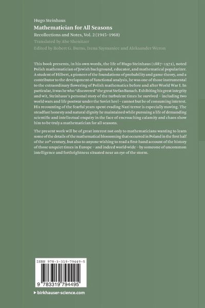This book presents, in his own words, the life of Hugo Steinhaus (1887-1972), noted Polish mathematician of Jewish background, educator, and mathematical popularizer. A student of Hilbert, a pioneer of the foundations of probability and game theory, and a contributor to the development of functional analysis, he was one of those instrumental to the extraordinary flowering of Polish mathematics before and after World War I. In particular, it was he who "discovered" the great Stefan Banach. Exhibiting his great integrity and wit, Steinhaus's personal story of the turbulent times he survived - including two world wars and life postwar under the Soviet heel - cannot but be of consuming interest. His recounting of the fearful years spent evading Nazi terror is especially moving. The steadfast honesty and natural dignity he maintained while pursuing a life of demanding scientific and intellectual enquiry in the face of encroaching calamity and chaos show him to be truly a mathematician for all seasons.