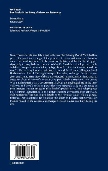 Numerous scientists have taken part in the war effort during World War I, but few gave it the passionate energy of the prominent Italian mathematician Volterra. As a convinced supporter of the cause of Britain and France, he struggled vigorously to carry Italy into the war in May 1915 and then developed a frenetic activity to support the war effort, going himself to the front, even though he was 55. This activity found an adequate echo with his French colleagues Borel, Hadamard and Picard. The huge correspondence they exchanged during the war, gives an extraordinary view of these activities, and raises numerous fundamental questions about the role of a scientist, and particularly a mathematician during WW I. It also offers a vivid documentation about the intellectual life of the time ; Volterra's and Borel's circles in particular were extremely wide and the range of their interests was not limited to their field of specialization. The book proposes the complete transcriptionof the aforementioned correspondence, annotated with numerous footnotes to give details on the contents. It also offers a general historical introduction to the context of the letters and several complements on themes related to the academic exchanges between France and Italy during the war.