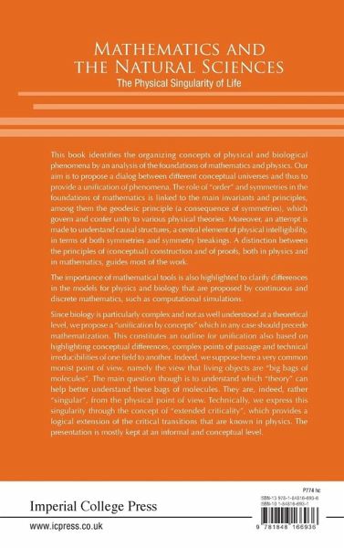 The book aims at the identification of the organising concepts of some physical and biological phenomena, by means of an analysis of the foundations of mathematics and of physics. This is done in the perspective of unifying phenomena, of bringing different conceptual universes into dialog. The analysis of the role of "order" and of symmetries in the foundations of mathematics is linked to the main invariants and principles, among which the geodesic principle (a consequence of symmetries), which govern and confer unity to the various physical theories. Moreover, we attempt to understand causal structures, a central element of physical intelligibility, in terms of symmetries and their breakings. The importance of the mathematical tool is also highlighted, enabling us to grasp the differences in the models for physics and biology which are proposed by continuous and discrete mathematics, such as computational simulations. A distinction between principles of (conceptual) construction and principles of proofs, both in physics and in mathematics, guides this part of the work. As for biology, being particularly difficult and not as thoroughly examined at a theoretical level, we propose a "unification by concepts," an attempt which should always precede mathematisation. This constitutes an outline for unification also basing itself upon the highlighting of conceptual differences, of complex points of passage, of technical irreducibilities of one field to another. Indeed, a monist point of view such as ours should not make us blind: we, the living objects, are surely just big bags of molecules or, at least, this is our main metaphysical assumption. The point though is: which theory can help us to better understand these bags of molecules, as they are, indeed, rather "singular," from the physical point of view. Technically, this singularity is expressed by the notion of "extended criticality," a notion that logically extends the pointwise critical transitions in physics.