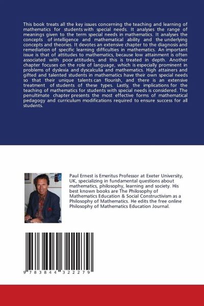 This book treats all the key issues concerning the teaching and learning of mathematics for students with special needs. It analyses the range of meanings given to the term special needs in mathematics. It analyses the concepts of intelligence and mathematical ability and the underlying concepts and theories. It devotes an extensive chapter to the diagnosis and remediation of specific learning difficulties in mathematics. An important issue is that of attitudes to mathematics, because low attainment is often associated with poor attitudes, and this is treated in depth. Another chapter focuses on the role of language, which is especially prominent in problems of dyslexia and dyscalculia and mathematics. High attainers and gifted and talented students in mathematics have their own special needs so that their unique talents can flourish, and there is an extensive treatment of students of these types. Lastly, the implications for the teaching of mathematics for students with special needs is considered. The penultimate chapter presents the most effective forms of mathematical pedagogy and curriculum modifications required to ensure success for all students.