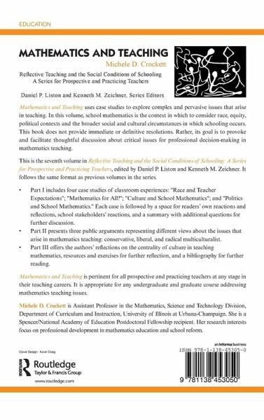Selected Contents: Table of Contents Series Preface iii Preface iv Acknowledgments x Introduction 1 PART I: CASES AND REACTIONS 12 Introduction to Case 1 12 Case 1: Race and Teacher Expectations 13 Reader Reactions to Race and Teacher Expectations 19 Reactions to Race and Teacher Expectation 20 Summary and Additional Questions 34 Introduction to Case 2 35 Case 2: Mathematics for All? 36 Reader Reactions to Mathematics for All? 42 Reactions to Mathematics for All? 43 Summary and Additional Questions 55 Introduction to Case 3 57 Case 3: Culture and School Mathematics 59 Reader Reactions to Culture and School Mathematics 64 Reactions to Culture and School Mathematics 65 Summary and Additional Questions 76 Introduction to Case 4 79 Case 4: Politics and School Mathematics 81 Reader Reactions to Politics and School Mathematics 87 Reactions to Politics and School Mathematics 88 Summary and Additional Questions 104 Reader Reactions to the Four Cases 107 Reactions to the Four Cases 108 Part II. Public Arguments 119 A Conservative View: Mathematics for Global Economic Leadership 122 Comments and Questions 135 A Liberal View: Equality of Opportunity and School Mathematics in a Democracy 138 Comments and Questions 147 A Radical Multiculturalist View: Mathematics for Developing Critical Dispositions for Social Reconstruction 150 Comments and Questions 164 Part III. Concluding Remarks, Some Reflections, and Resources for Further Reflections