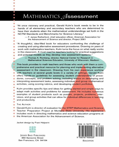 "A thoughtful, idea-filled book for educators confronting the challenge of creating and using alternative assessment procedures. Drawing on years of work with mathematics teachers, Kulm turns the focus on what really works in the classroom. A must read for teachers looking for practical suggestions and potential models as they develop new assessment systems."-Thomas A. Romberg, director, National Center for Research in Mathematical Sciences Education, University of Wisconsin-Madison