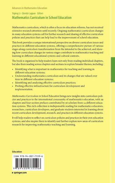 It will help readers to reflect on curriculum policies and practices in their own education systems, and also inspire them to identify and further explore new areas of curriculum research for improving mathematics teaching and learning.