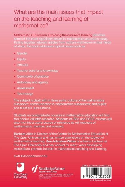 Mathematics Education identifies some of the most significant issues in mathematics education today. Pulling together relevant articles from authors well-known in their fields of study, the book addresses topical issues such as: gender equity attitude teacher belief and knowledge community of practice autonomy and agency assessment technology. The subject is dealt with in three parts: culture of the mathematics classroom, communication in mathematics classrooms and pupils' and teachers' perceptions. Students on postgraduate courses in mathematics education will find this book a valuable resource. Students on BEd and PGCE courses will also find this a useful source of reference as will teachers of mathematics, mentors and advisers.